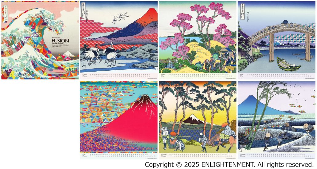 The artwork for the 2026 Komori Calendar is titled “NEO HOKUSAI”. The creative unit ENLIGHTENMENT has reconstructed the masterpiece “Thirty-six Views of Mount Fuji” by the Edo-period ukiyo-e artist Katsushika Hokusai using a contemporary perspective and computer technology. This collection, where natural beauty harmonizes with modern geometric patterns, express the calendar’s theme: “FUSION ‘Nature & Technology’”. Printed entirely on Komori presses, it leverages RGB printing with the J-throne 29, a cutting-edge UV inkjet digital press, combined with the unique capabilities of multi-color offset presses, enhancing the artwork’s quality through print technology. We invite you to enjoy this new world of expression born from the fusion of tradition and innovation.